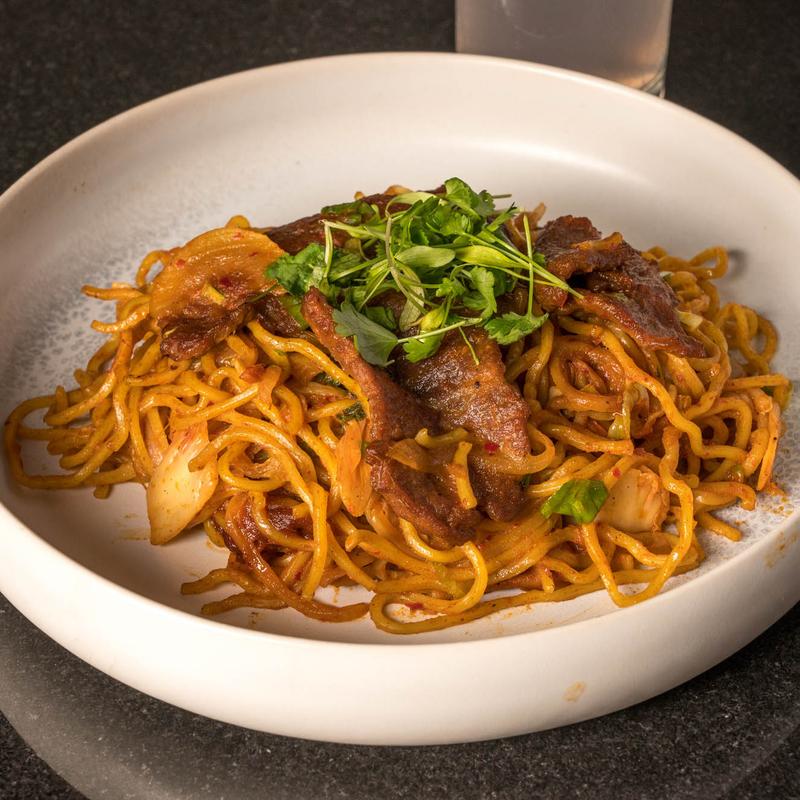 Yakisoba, house-made curry laksa, tofu puff, cucumber and bean sprout slaw, hard-boiled egg, rau ram leaf