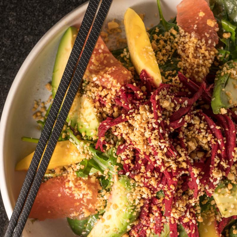 Baby kale, mango, avocado, grapefruit, beet-jicama, sesame-peanut crunch, mango vinaigrette